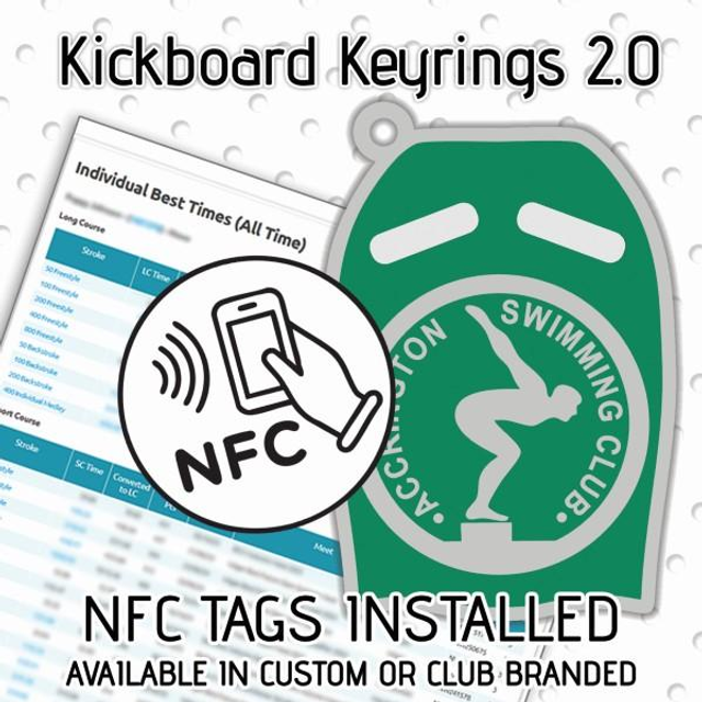 This swimming kickboard–style keyring features an integrated NFC tag that gives you instant access to your child’s individual personal bests on the Swim England website. Simply tap the keyring with any NFC-enabled smartphone and you’re taken straight to their results.